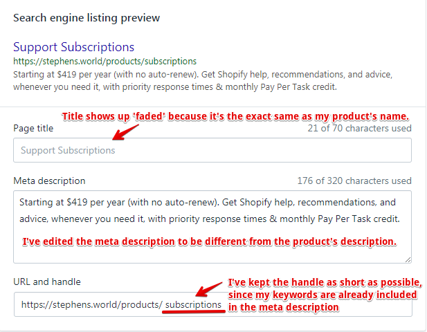 По умолчанию он будет использовать полное имя продукта / коллекции / блога / страницы в качестве заголовка SEO, а затем первое или два предложения для мета-описания. Часто это может выглядеть немного неуклюже, если название продукта действительно длинное или описание сильно отформатировано (что может привести к тому, что мета-описание будет немного беспорядочным при запуске).